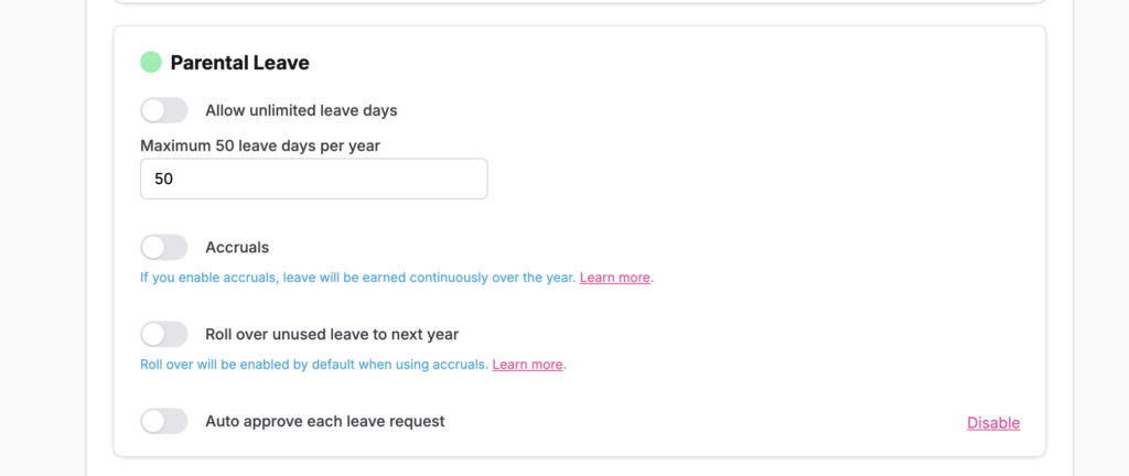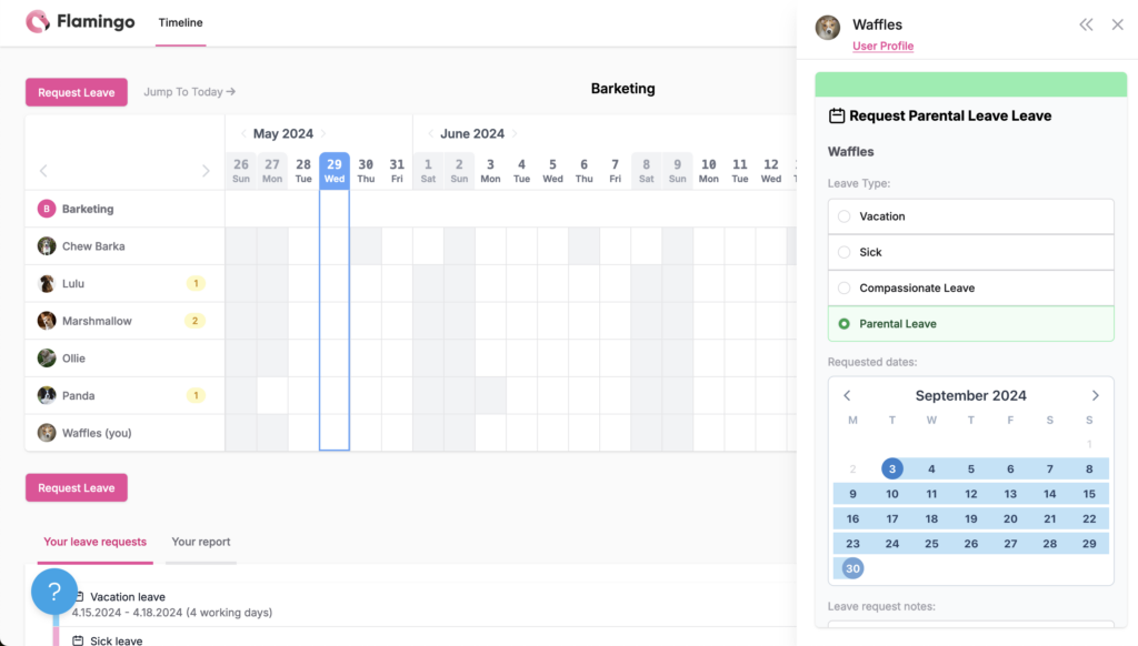 If you’re a Flamingo user, add paternity leave or parental leave to your leave policy to let your team members know what they can expect after the birth of their child.