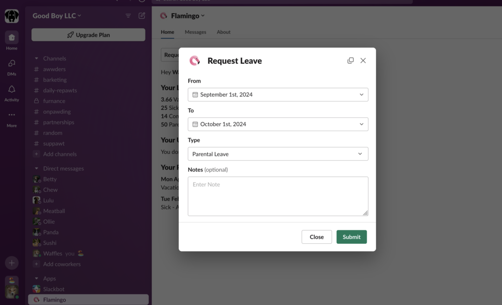 Now it will be easy and stress-free for employees to book in their parental leave, either through Slack, MS Teams or the Flamingo web app.
